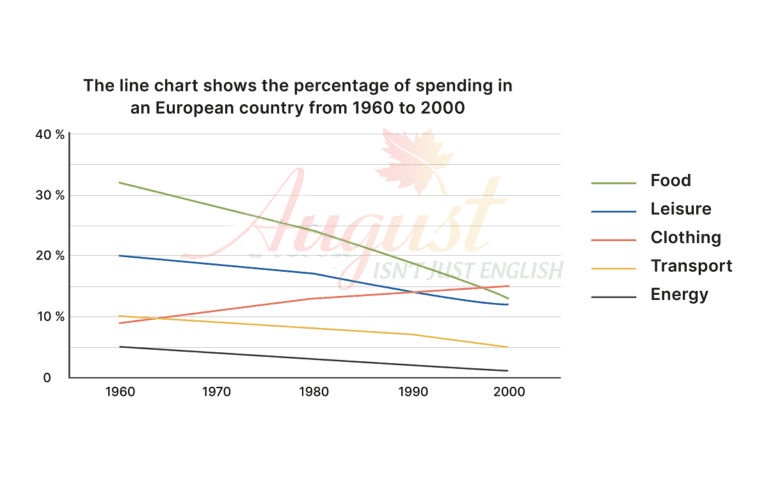 The line chart shows the percentage of spending in a European country from 1960 to 2000. Summarise the information by selecting and reporting the main features, and make comparisons where relevant.