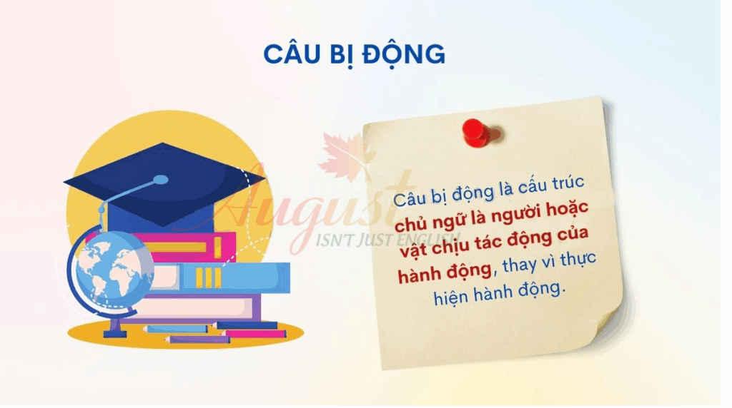 Câu bị động (Passive voice) là cấu trúc câu trong tiếng Anh mà trong đó chủ ngữ là người hoặc vật chịu tác động của hành động, thay vì thực hiện hành động.