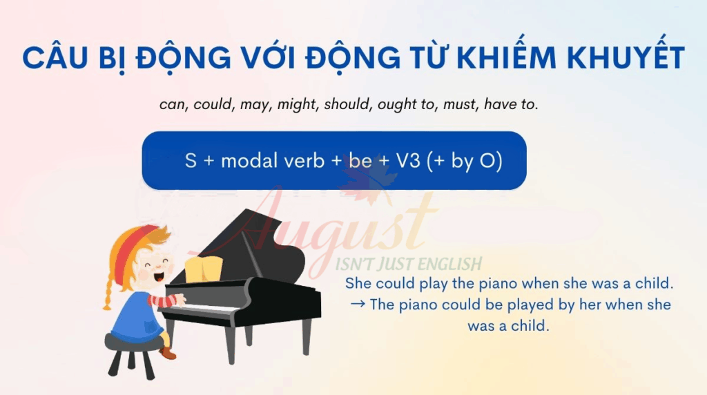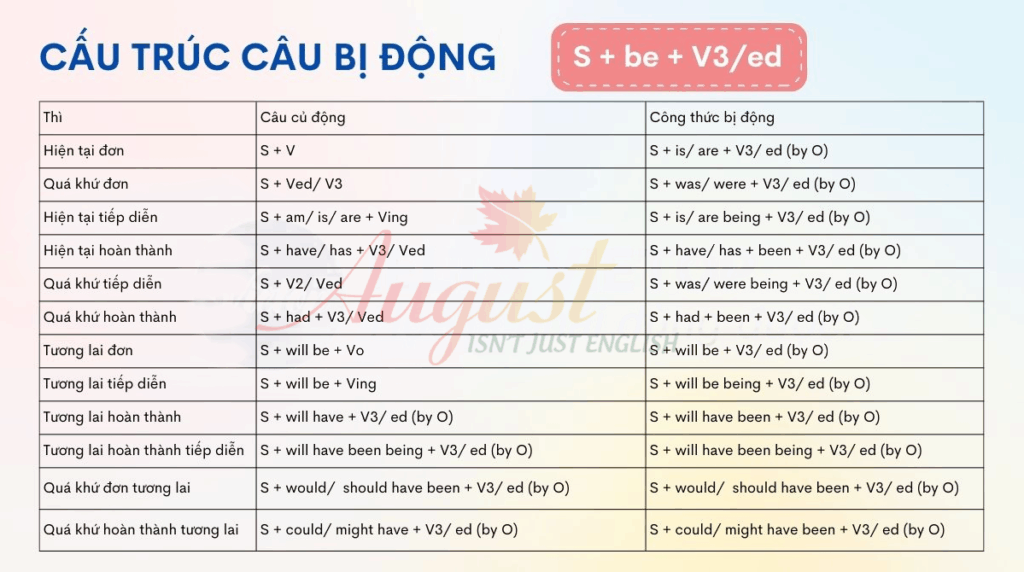 Câu bị động dùng để nhấn mạnh một người hay vật chịu tác động của hành động. Đây là một trong những dạng bài có nhiều công thức và thường xuất hiện trong đề thi, đề kiểm tra. Để giúp người học hiểu rõ hơn về cách sử dụng các dạng câu bị động, mình đã tổng hợp các nội dung như sau: