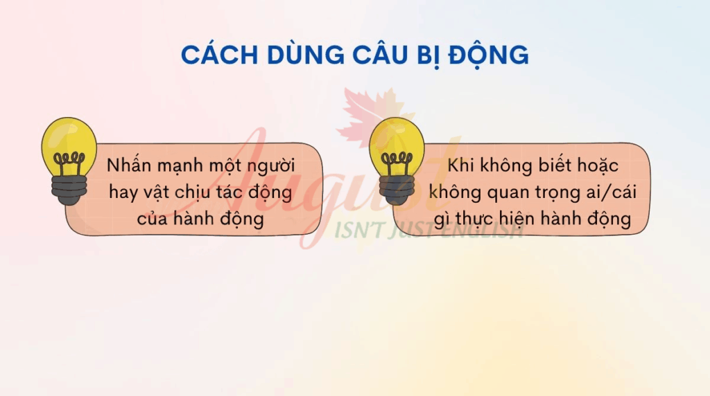 | Khi không biết hoặc không quan trọng ai/ cái gì thực hiện hành động | My bike was stolen. (Xe đạp của tôi đã bị đánh cắp.) A new hospital has been built in the city. (Một bệnh viện mới đã được xây dựng trong thành phố.) English is spoken all over the world. (Tiếng Anh được nói khắp thế giới.) |