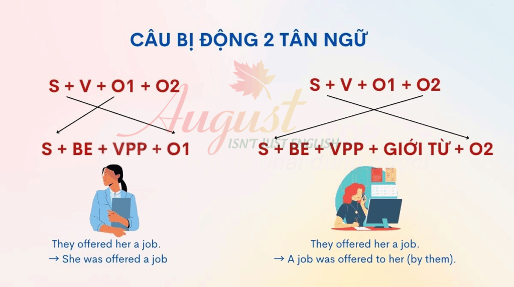 Trong một vài trường hợp, các câu tiếng Anh sẽ có 2 tân ngữ theo cấu trúc: V + someone + something. Do đó, khi chuyển thành câu bị động cũng có 2 cách chuyển như sau: