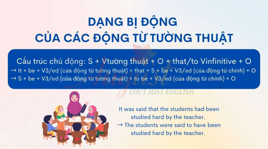 - It was said that the students had been studied hard by the teacher. → The students were said to have been studied hard by the teacher. (Học sinh được cho là đã được học tập chăm chỉ bởi cô giáo.)
