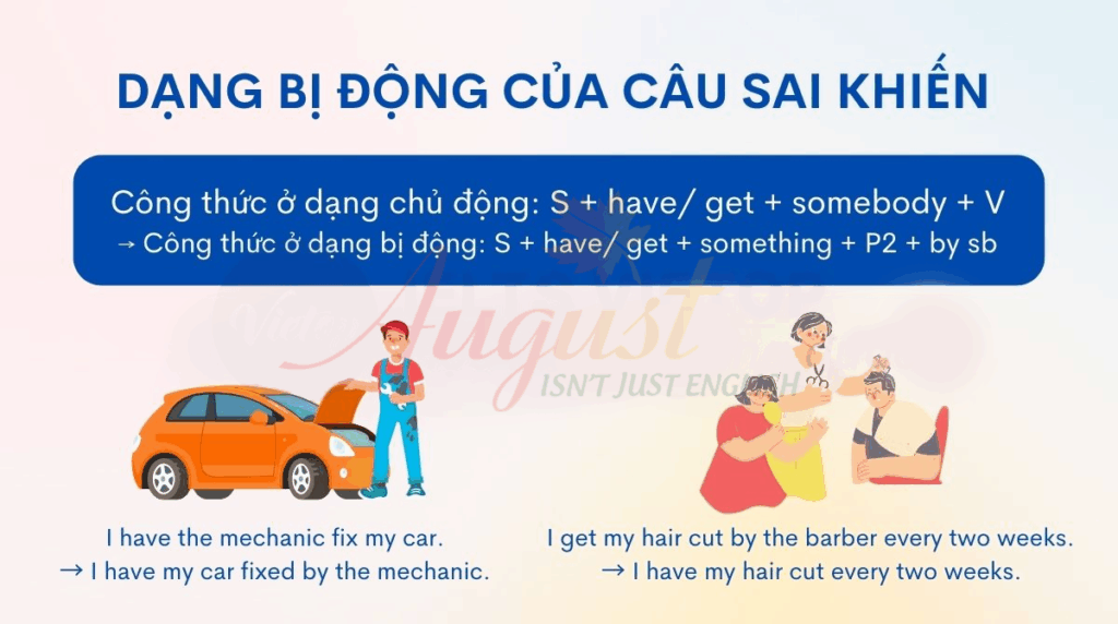 - I have the mechanic fix my car. → I have my car fixed by the mechanic. (Xe của tôi đã được sửa bởi thợ sửa xe.)