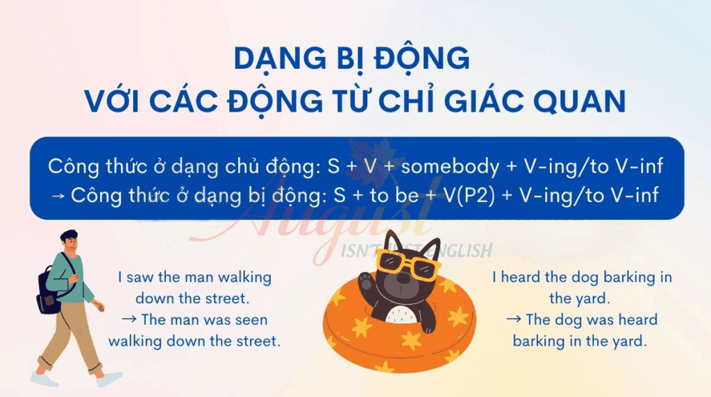 - I saw the man walking down the street. → The man was seen walking down the street. (Người đàn ông đã được nhìn thấy đang đi xuống phố.)