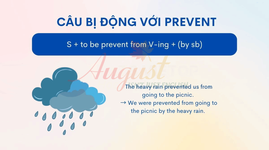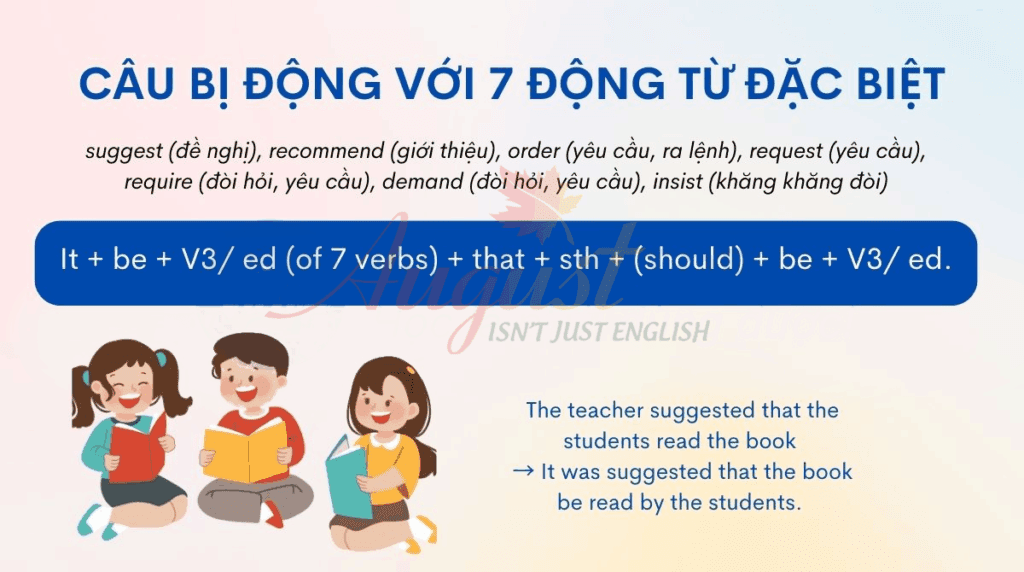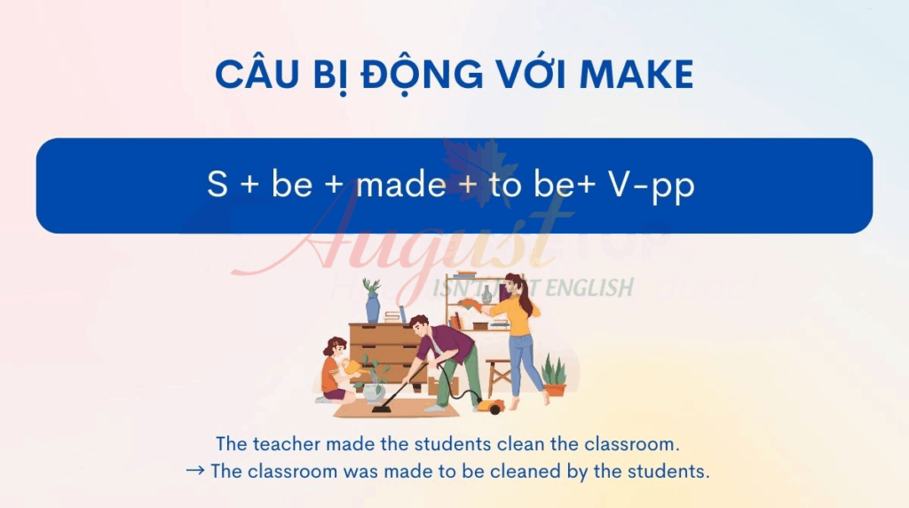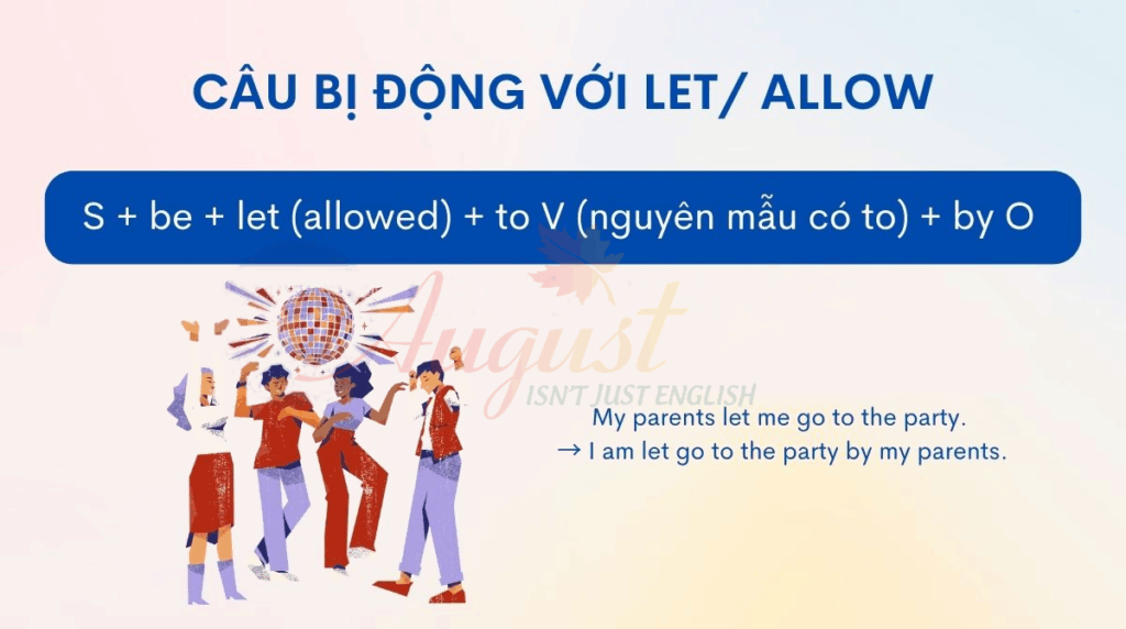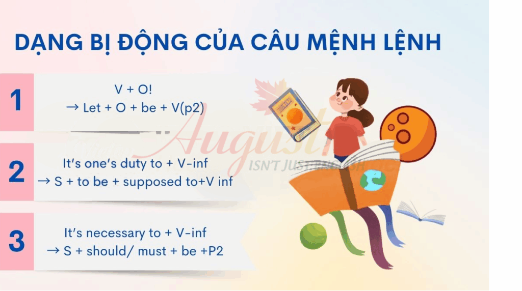 | V + O! | Let + O + be + V(p2) | Close the door! → Let the door be closed! (Hãy đóng cửa lại!) Turn off the lights! → Let the lights be turned off! (Hãy tắt đèn đi!) Stop talking! → Let the talking be stopped! (Hãy ngừng nói chuyện!) |