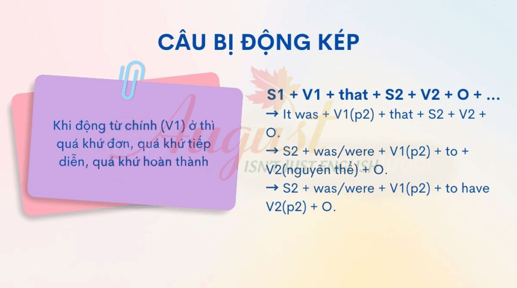 | It was + V1 (p2) + that + S2 + V2 + O. | Khi động từ chính (V1) ở thì quá khứ đơn, quá khứ tiếp diễn, quá khứ hoàn thành | People thought that he was a genius. → It was thought that he was a genius. (Người ta đã nghĩ rằng anh ấy là một thiên tài.) They reported that the company was facing bankruptcy. → It was reported that the company was facing bankruptcy. (Người ta đã báo cáo rằng công ty đang đối mặt với sự phá sản.) Scientists had believed that the earth was flat. → It was believed that the earth was flat. (Người ta đã tin rằng Trái Đất là phẳng.) |