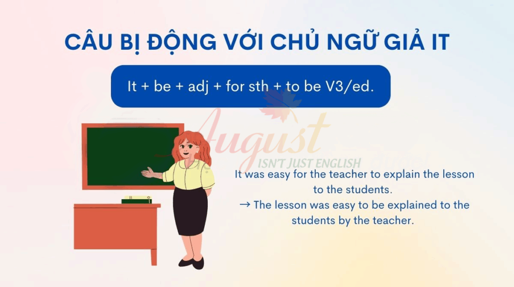 → The poem is taught to the students by the teacher. (Bài thơ được dạy cho học sinh bởi cô giáo) – Câu bị động này nhấn mạnh vào hành động được dạy và tân ngữ trực tiếp bài thơ. Nó cho ta biết rằng bài thơ được dạy cho học sinh bởi cô giáo.