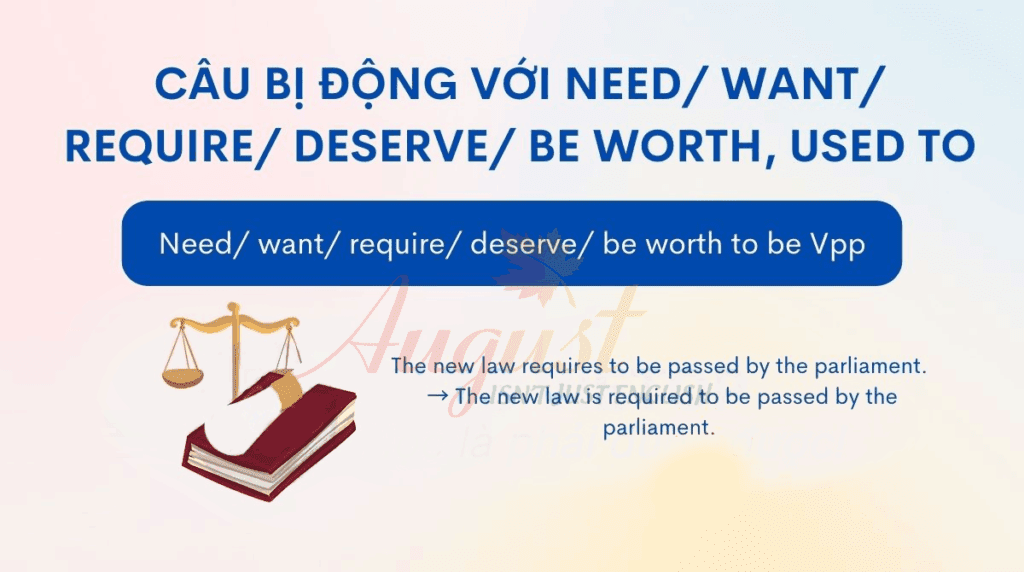 | It’s necessary to + V-inf | S + should/ must + be + P2 | It’s necessary to study hard to get good grades. → Good grades should be obtained by studying hard. (Điểm cao cần được đạt được bằng cách học tập chăm chỉ.) It’s necessary to see a doctor if you’re feeling sick. → A doctor should be seen if you’re feeling sick. (Bạn nên đi khám bác sĩ nếu bạn cảm thấy ốm.) It’s necessary to save money for the future. → Money should be saved for the future. (Tiền cần được tiết kiệm cho tương lai.) |