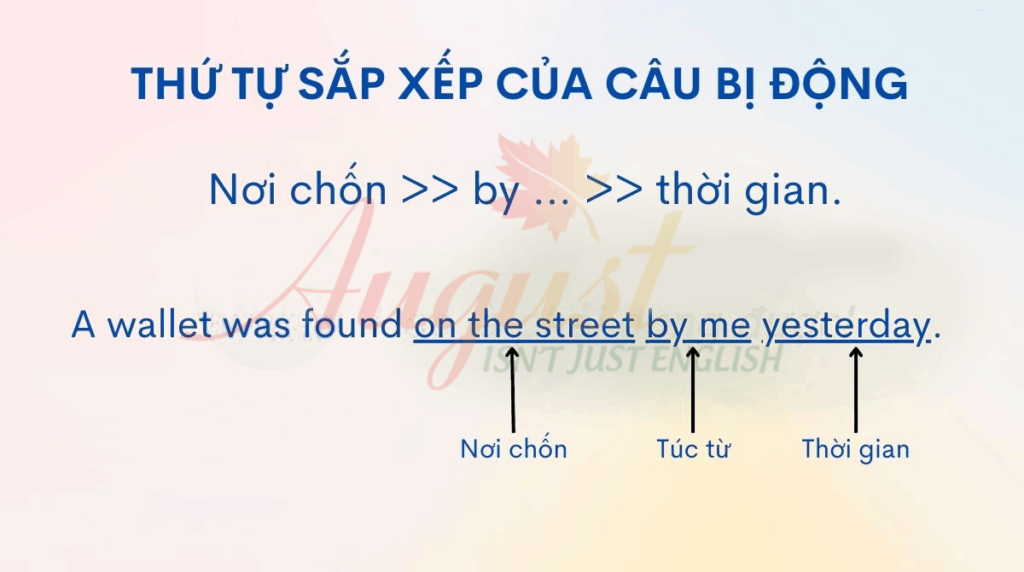- A wallet was found on the street by me yesterday. (Một chiếc ví đã được tìm thấy trên đường phố bởi tôi ngày hôm qua.) → Câu có nơi chốn, by và từ chỉ thời gian.