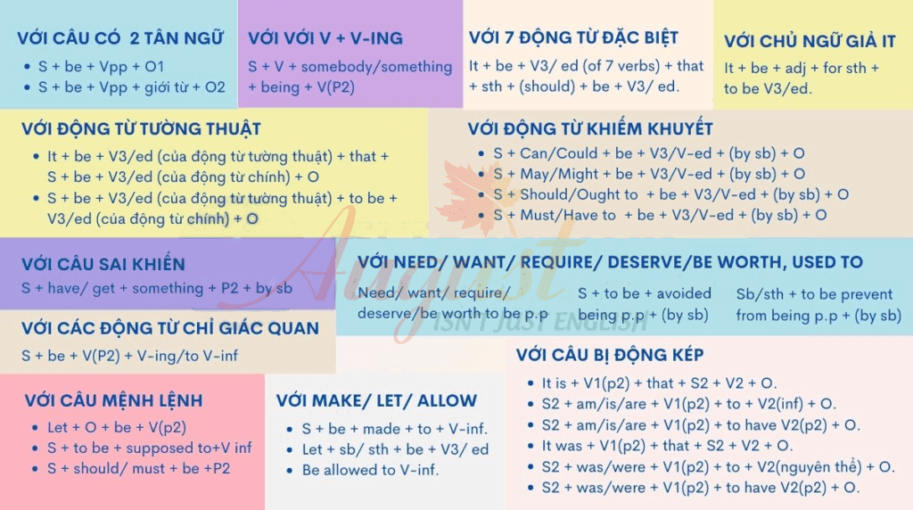 Dưới đây là các dạng câu bị động thường gặp, các bạn tham khảo để ứng dụng vào thực tế nhé!