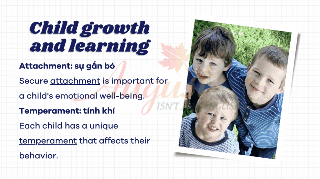| Attachment | /əˈtætʃmənt/ | Sự gắn bó | Secure attachment is important for a child’s emotional well-being. (Sự gắn bó an toàn rất quan trọng đối với sức khỏe cảm xúc của trẻ.) |