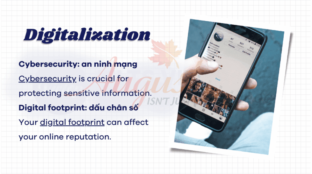 | Digital footprint | /ˈdɪdʒɪtl ˈfʊtprɪnt/ | Dấu chân số | Your digital footprint can affect your online reputation. (Dấu chân số của bạn có thể ảnh hưởng đến danh tiếng trực tuyến của bạn.) |
