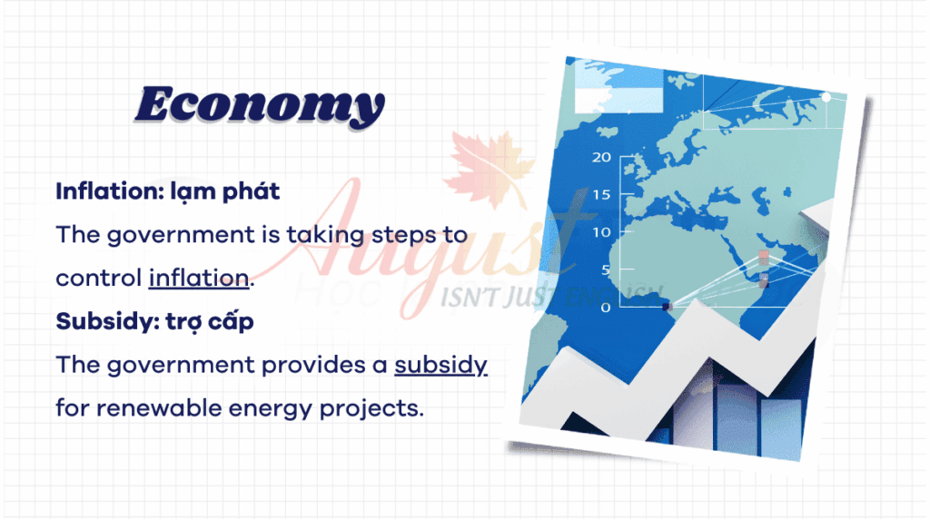 | Inflation | /ɪnˈfleɪʃən/ | Lạm phát | Inflation can erode the purchasing power of money. (Lạm phát có thể làm giảm sức mua của tiền.) |