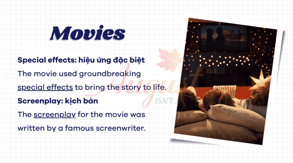 | Leisure time | /ˈliːʒə taɪm/ | Thời gian giải trí | She tries to make the most of her leisure time. (Cô ấy cố gắng tận dụng hết thời gian giải trí của mình.) |