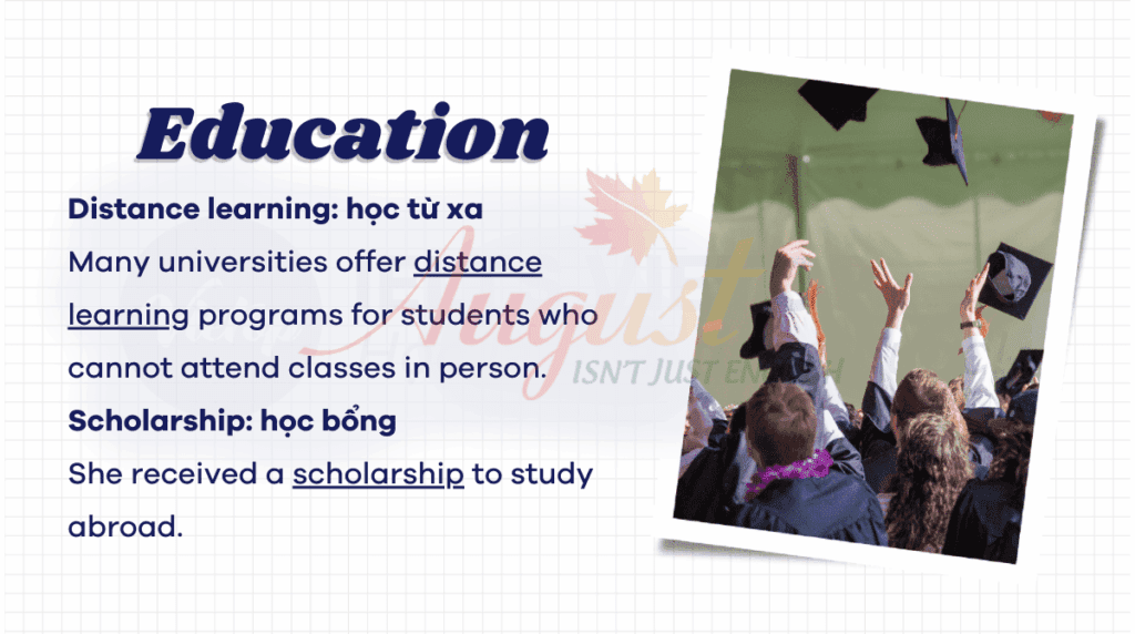 | Vocabulary | /vəʊˈkæbjʊləri/ | Từ vựng | Expanding a child’s vocabulary is key to language development. (Mở rộng vốn từ vựng của trẻ là chìa khóa cho sự phát triển ngôn ngữ.) |